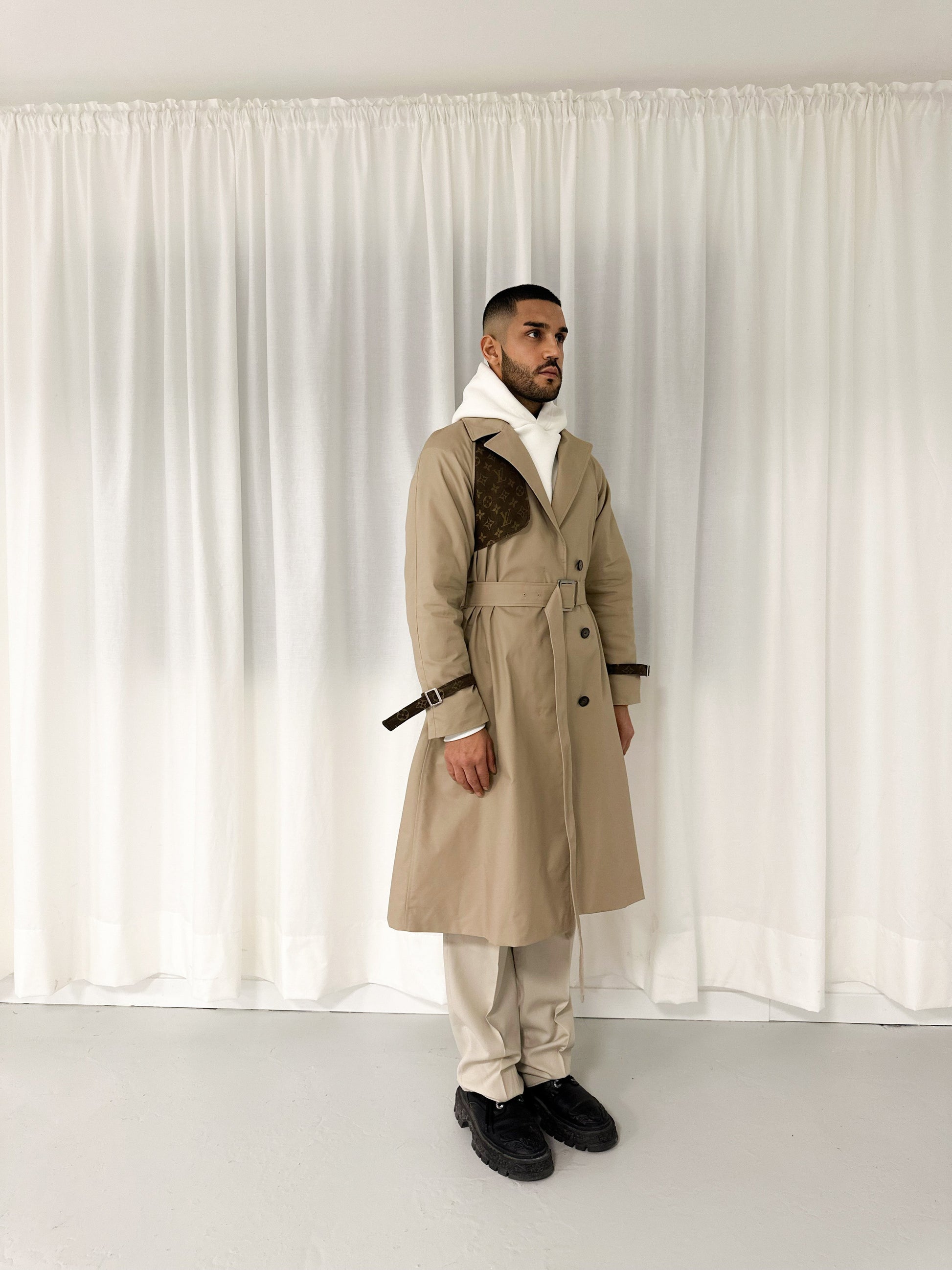 Trench upcyclé avec empiècement de toile d'une valise ou de châle