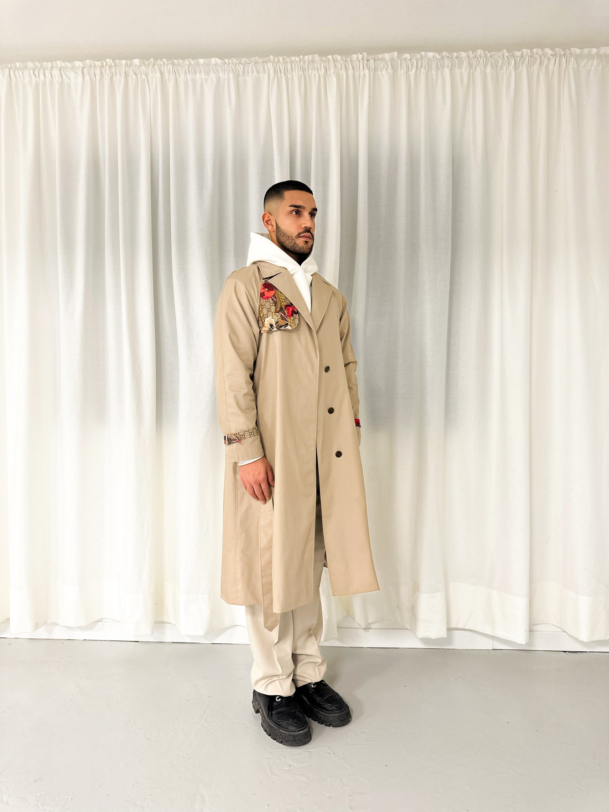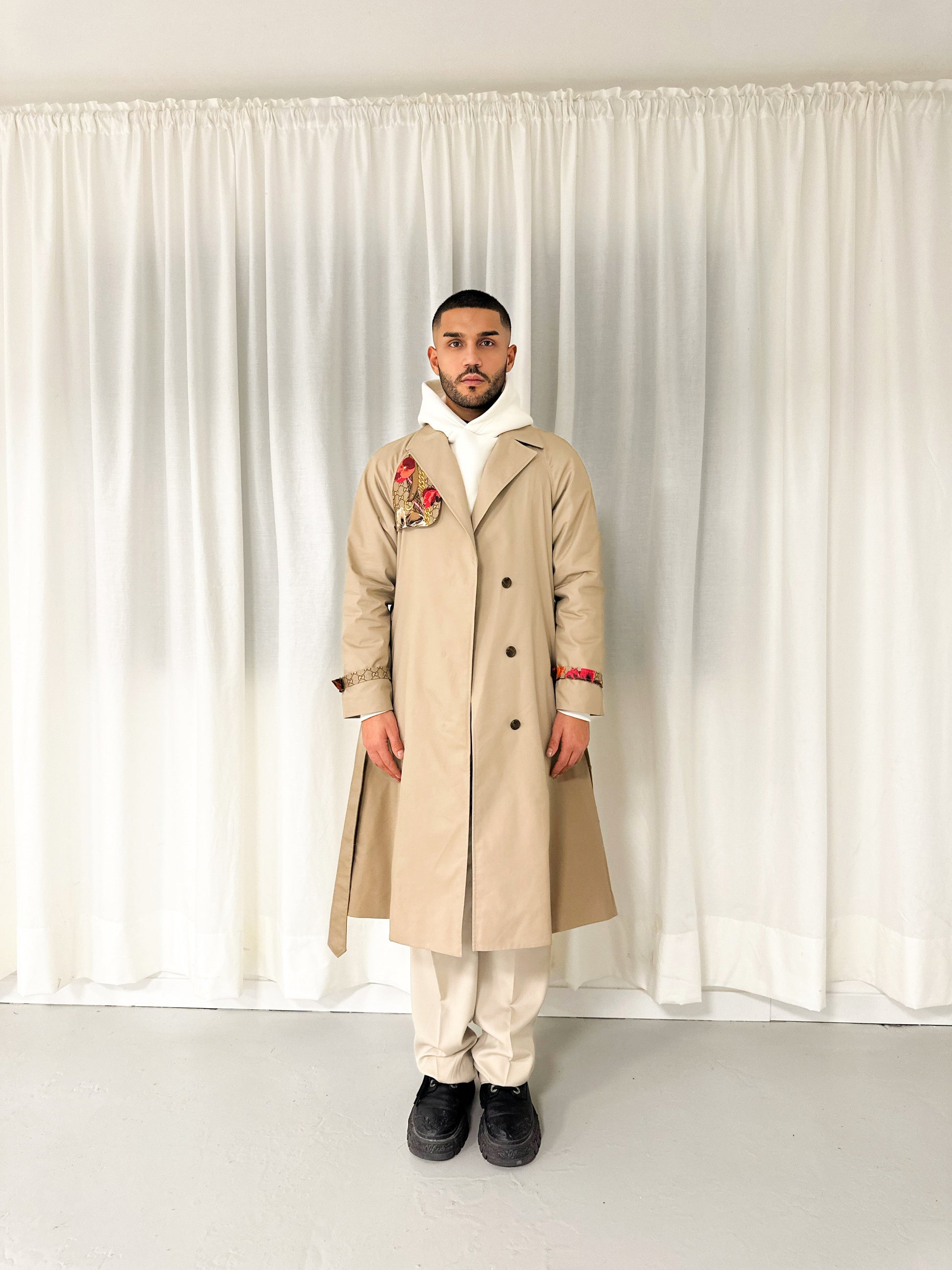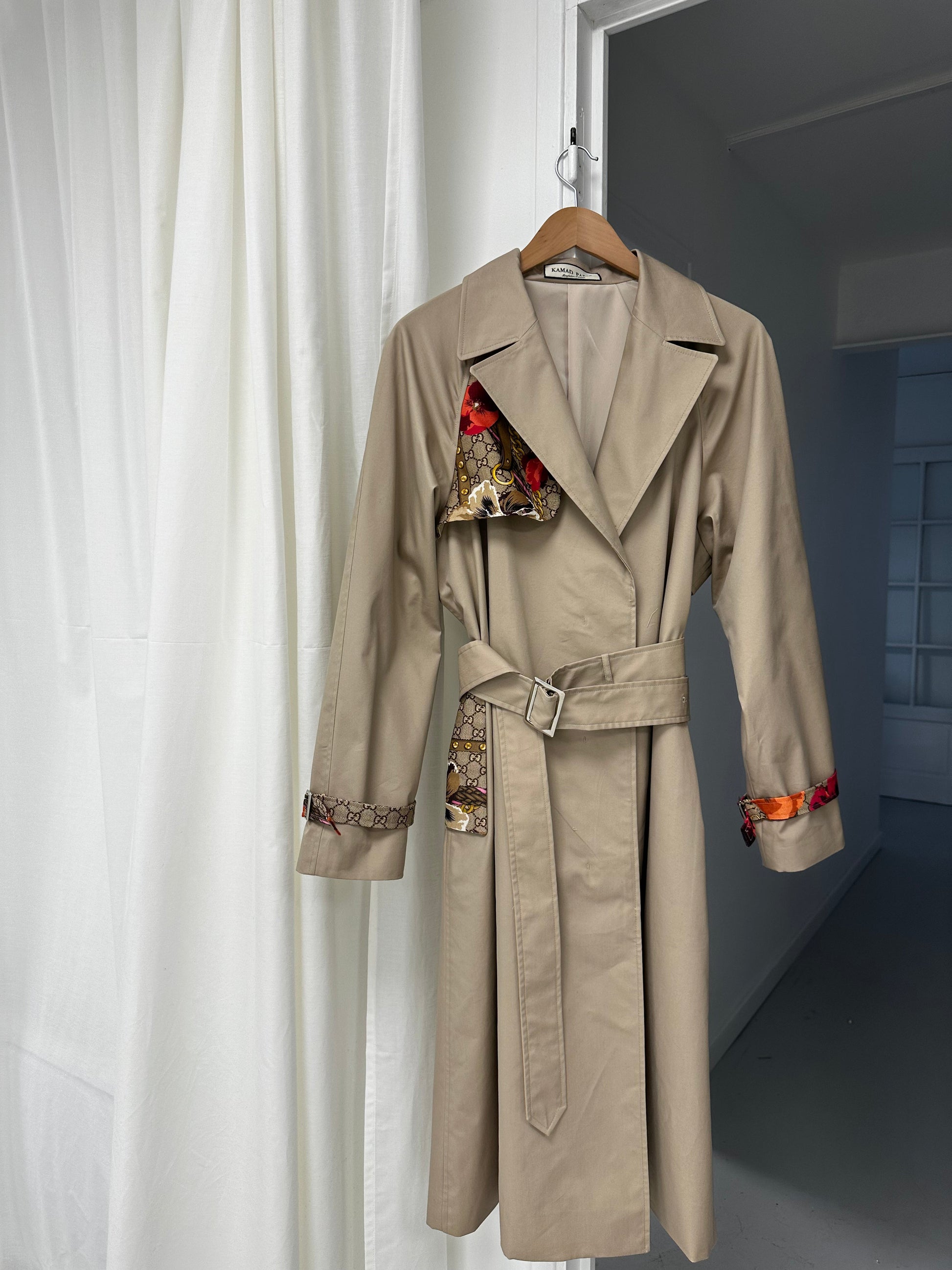 Trench upcyclé avec empiècement de toile d'une valise ou de châle