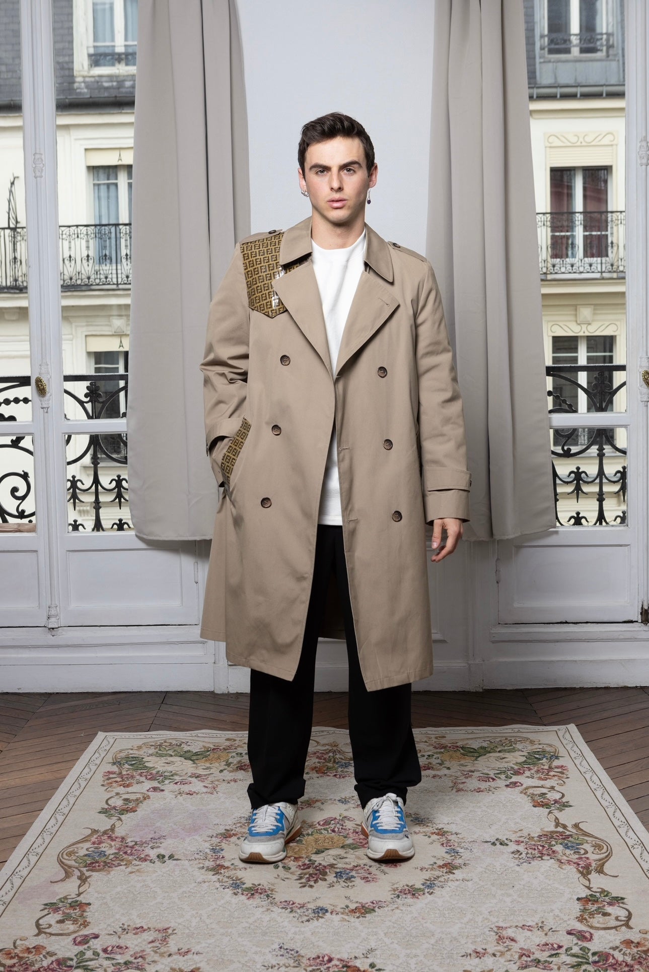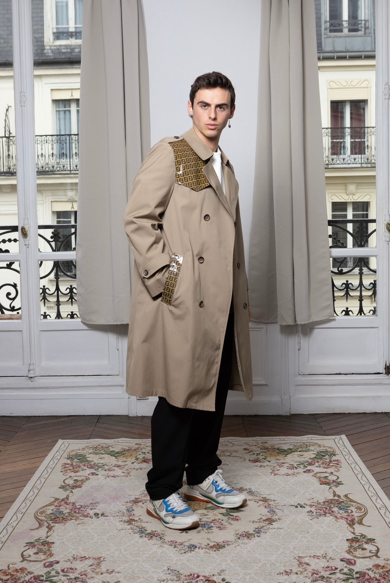 Trench upcyclé avec empiècement de toile d'une valise ou de châle