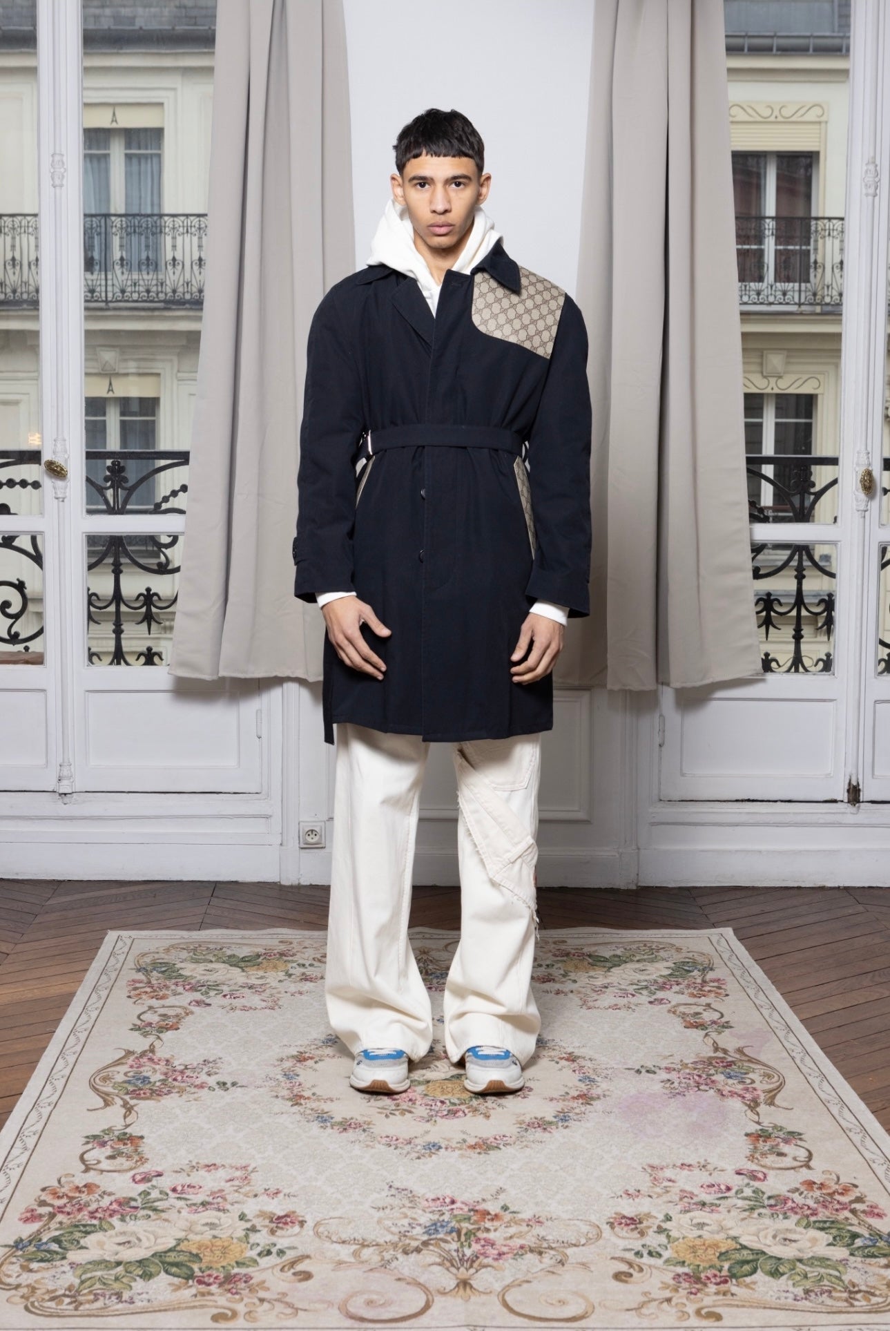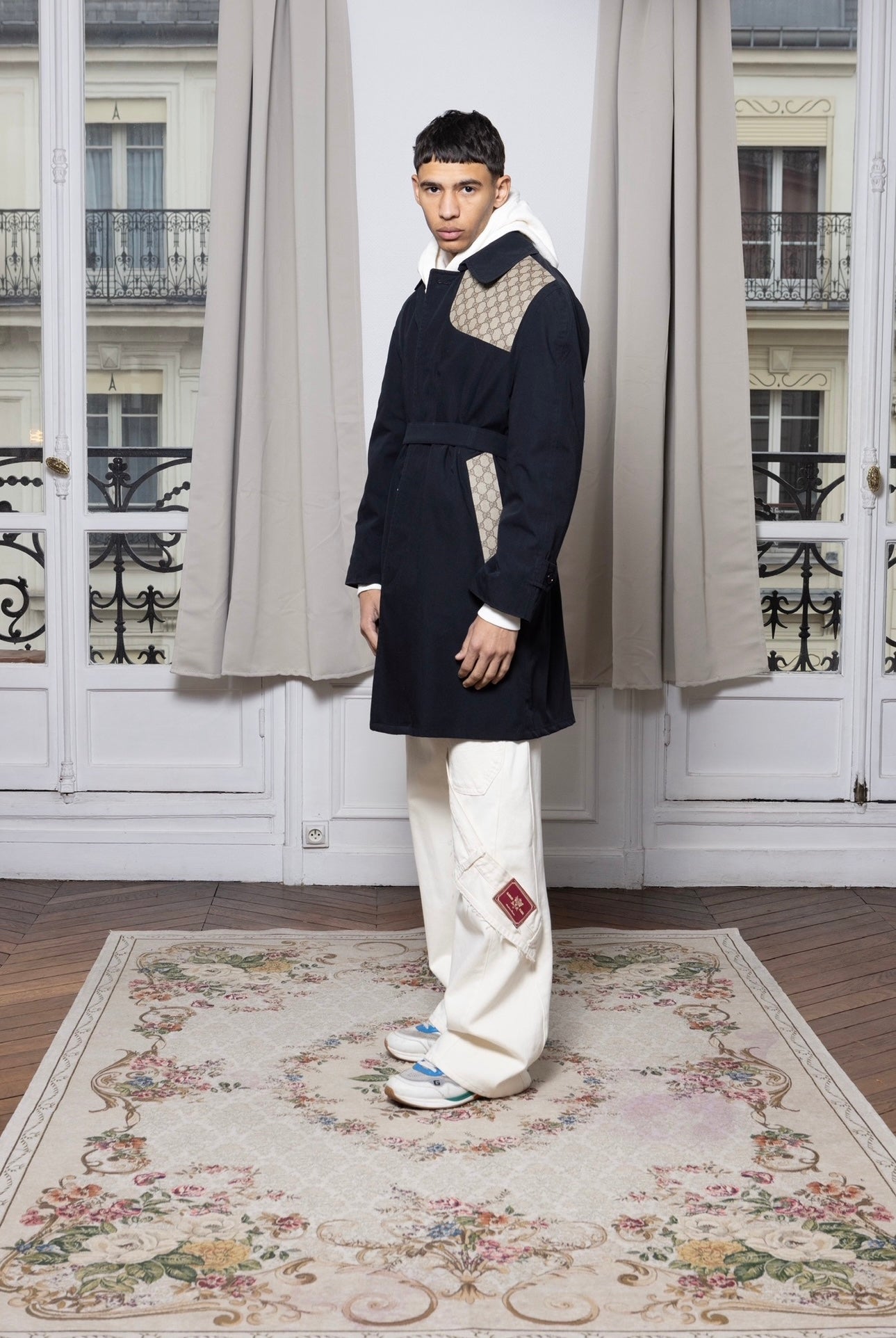 Trench upcyclé avec empiècement de toile d'une valise ou de châle