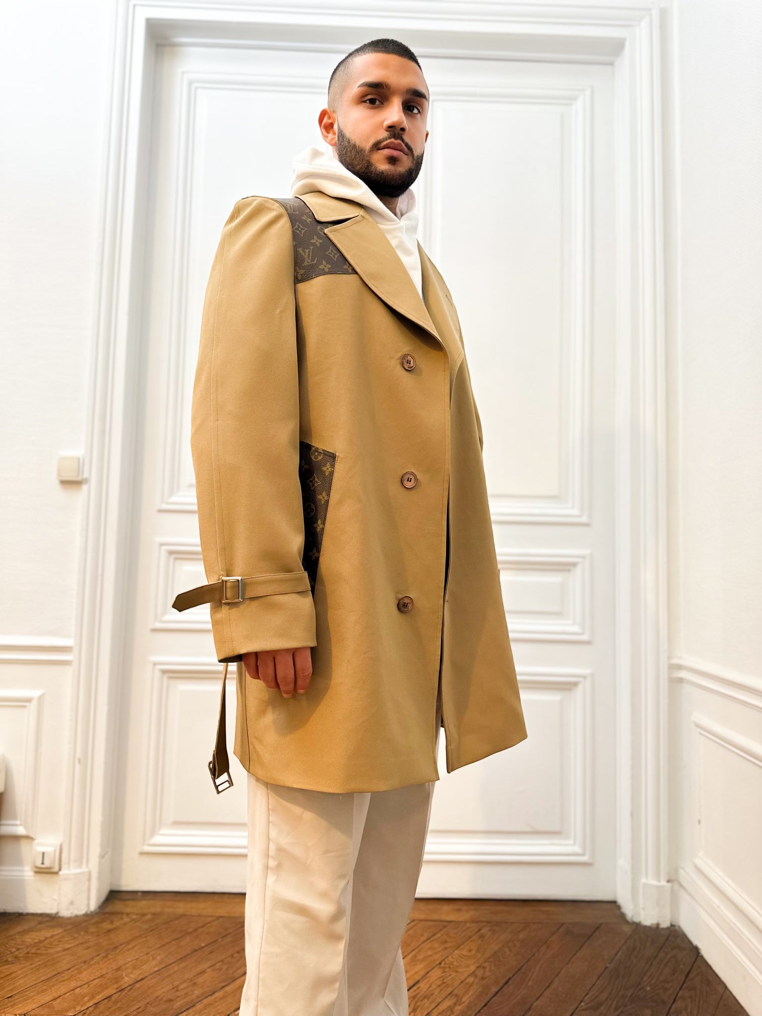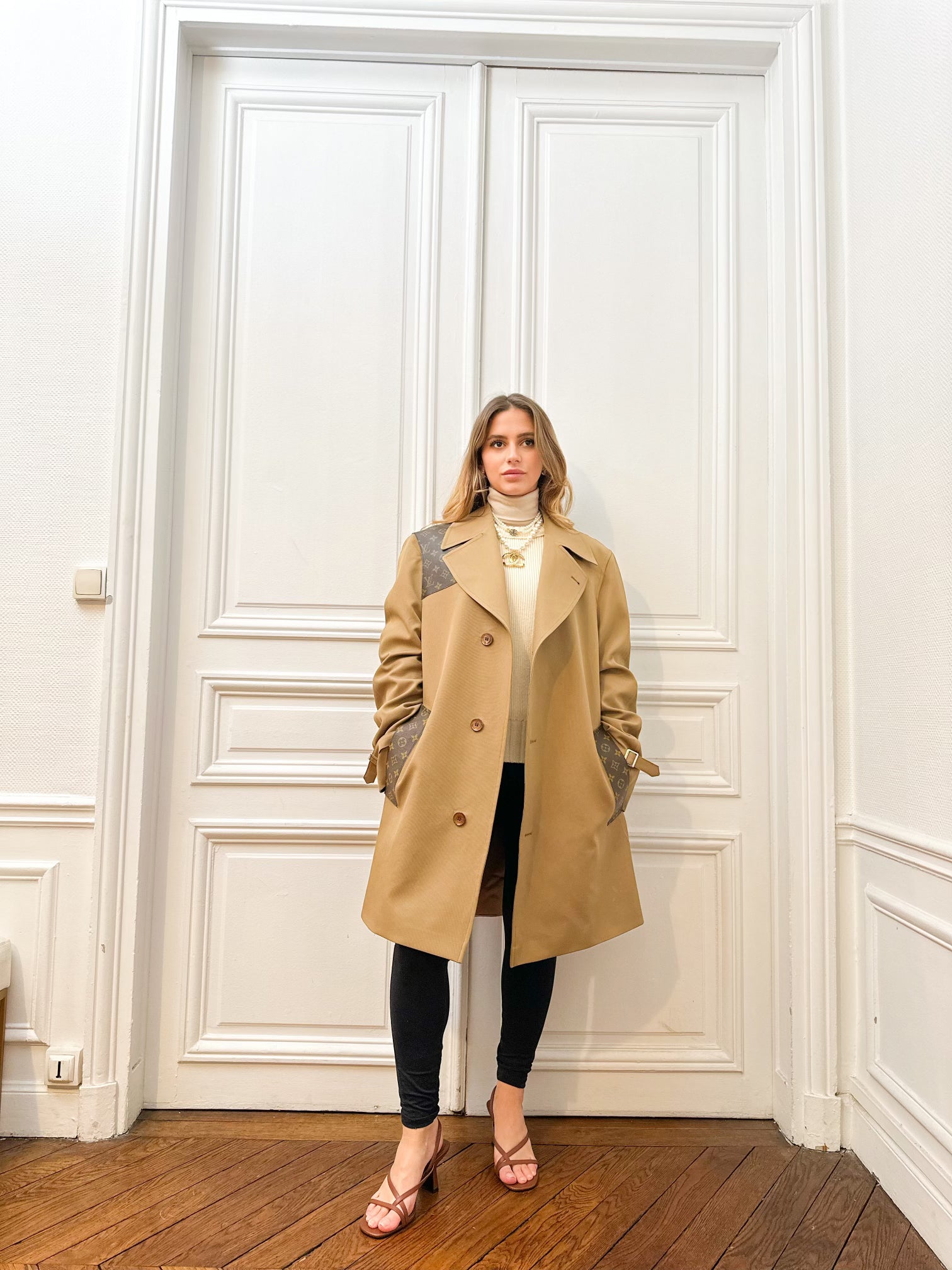 Trench upcyclé avec empiècement de toile d'une valise ou de châle