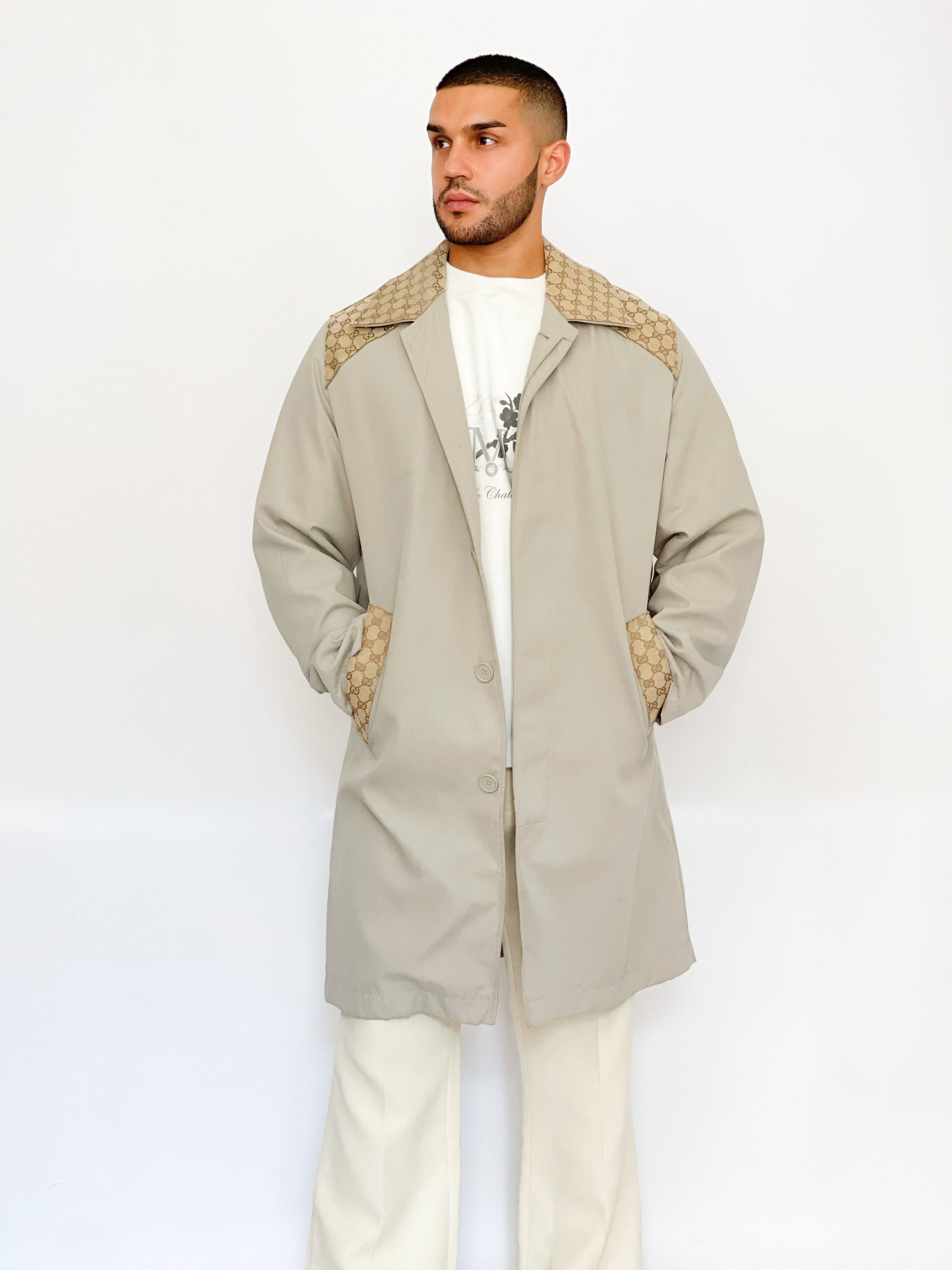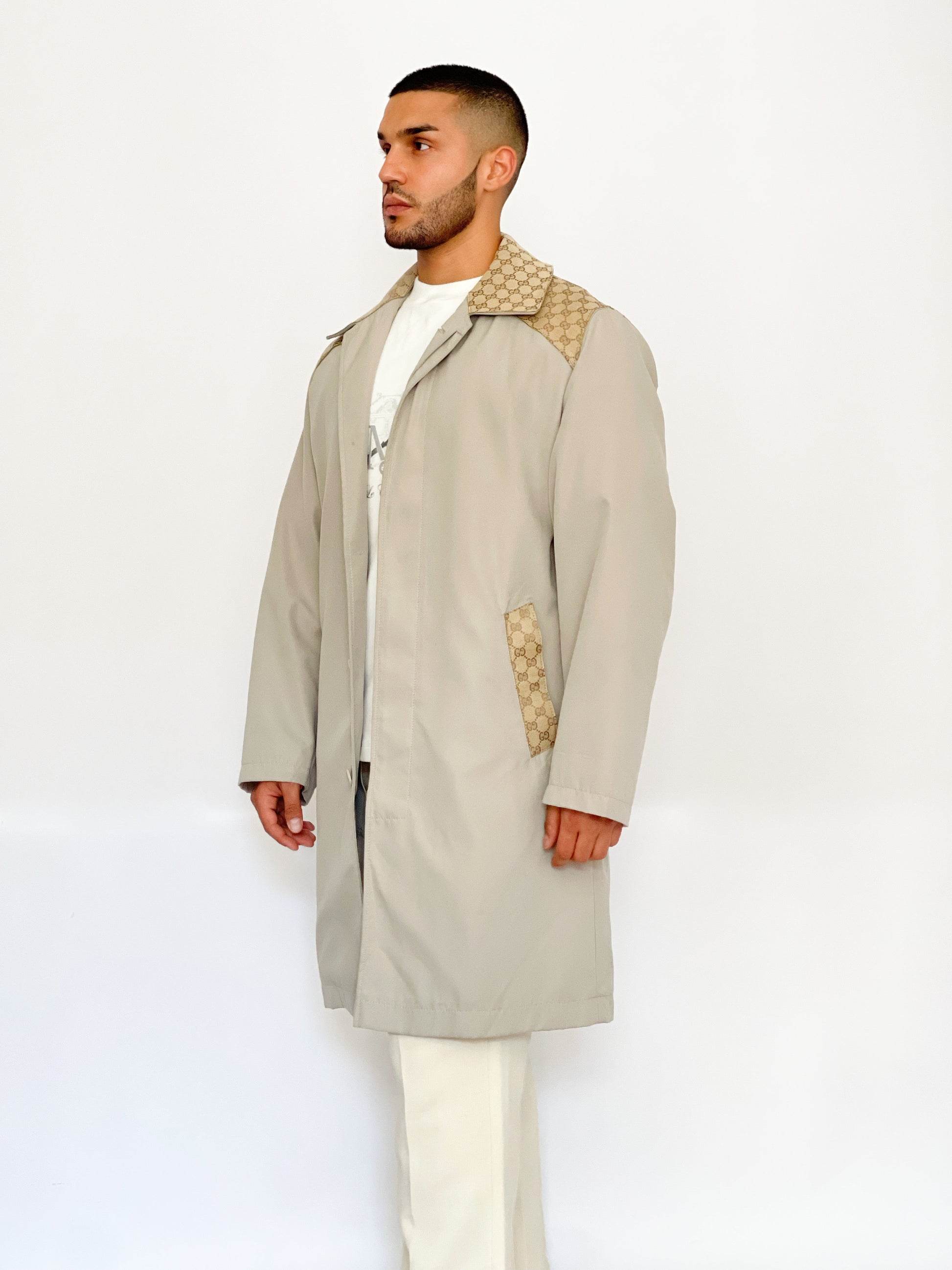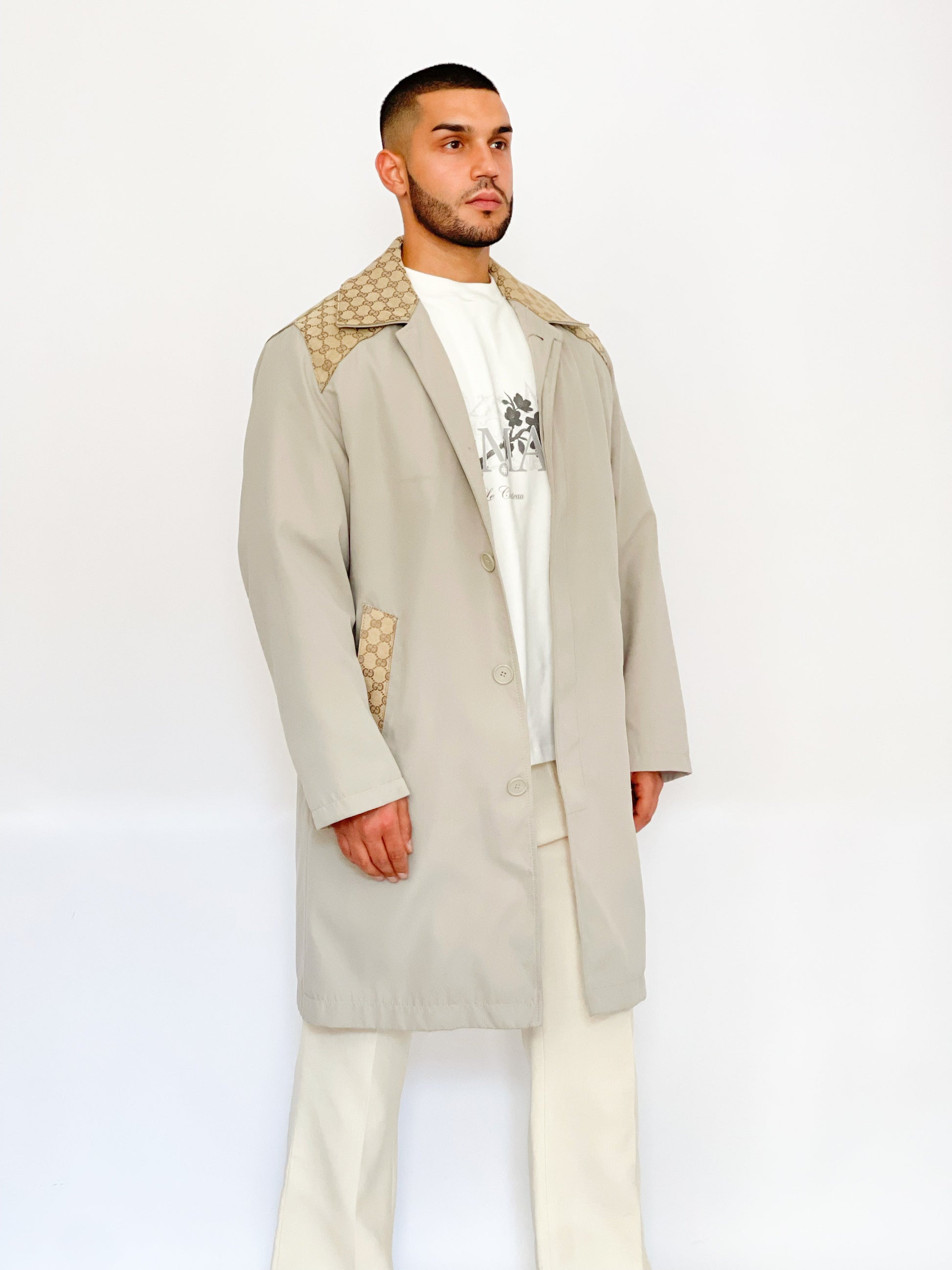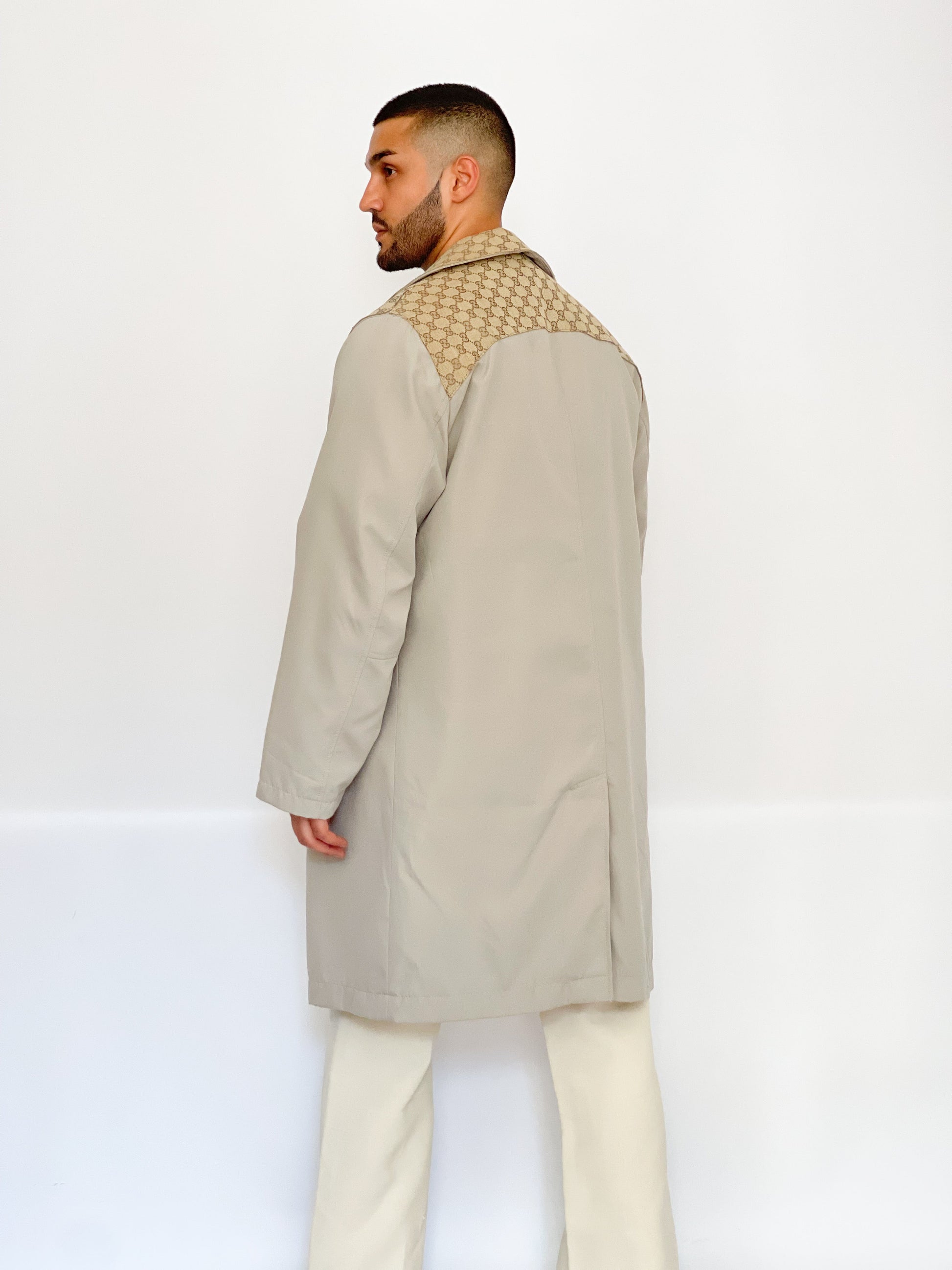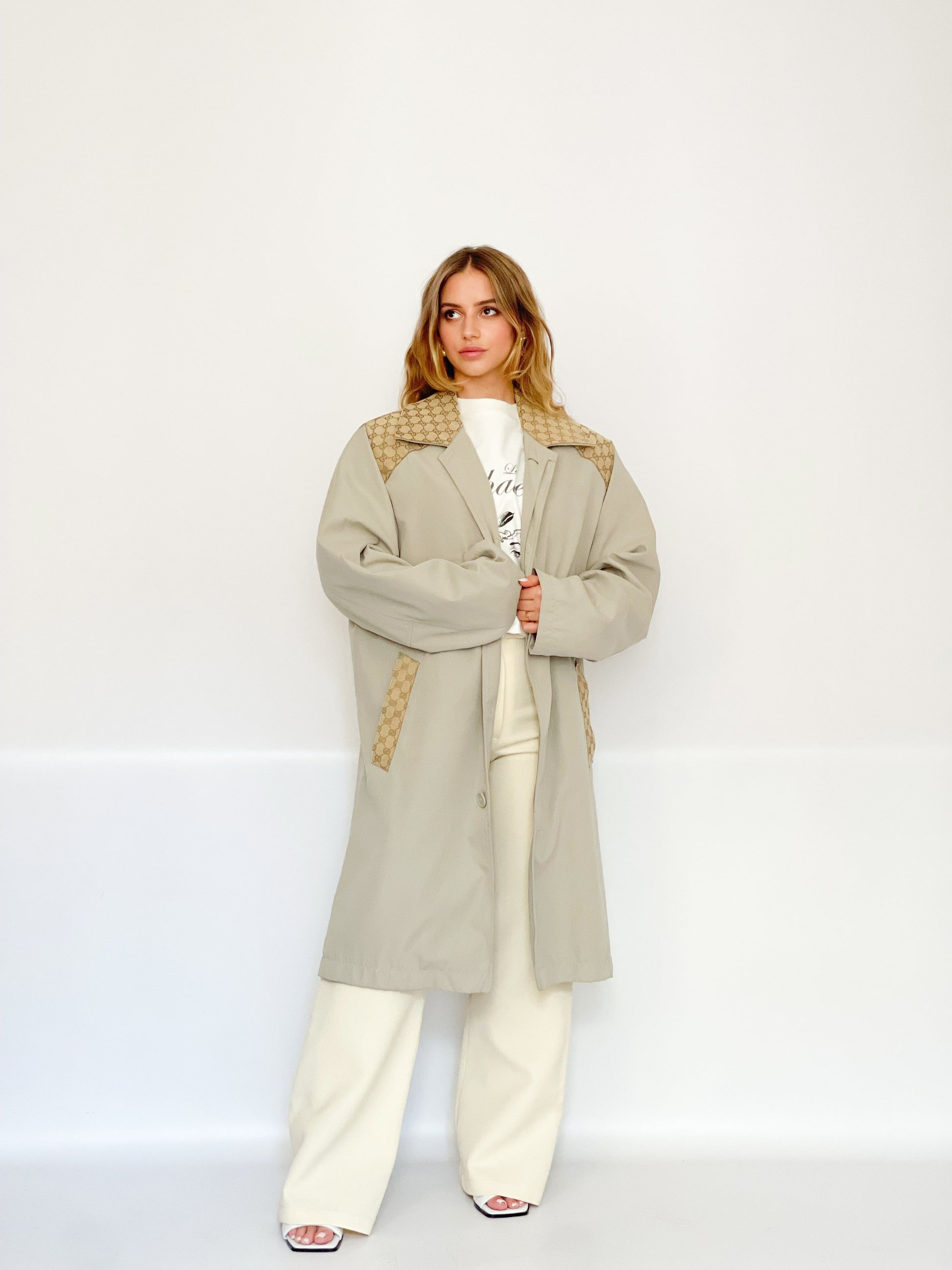 Trench upcyclé avec empiècement de toile d'une valise ou de châle